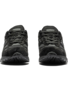 O cabedal é construído com uma base de malha (mesh) respirável de alta qualidade, reforçada por sobreposições luxuosas em camurça suína. Essa combinação não só oferece uma textura rica e visual premium, mas também garante a durabilidade que se espera de um New Balance de topo de linha. Detalhes refletivos completam o design, garantindo visibilidade e um toque extra de estilo.